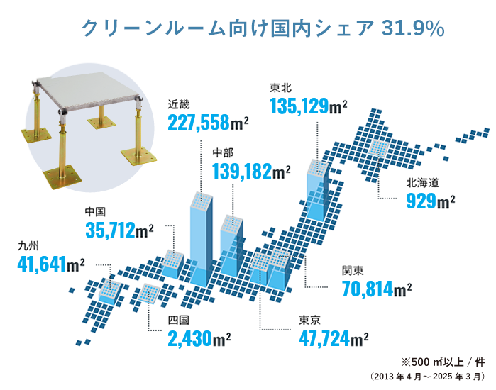 アーレスティのモバフロアは北海道から沖縄県まで47都道府県に納入され、各地のクリーンルーム、コンピューターセンター、工場、オフィスなど幅広く活用されています。