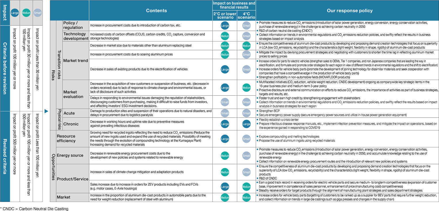 To identify risks and opportunities due to climate change and disclose the degree of impact on its financial plans and the countermeasures to be taken, the Ahresty Group is extracting risks and opportunities for fiscal 2030, using the 1.5 to 2°C and 4°C climate-related scenarios published by IEA or IPCC.